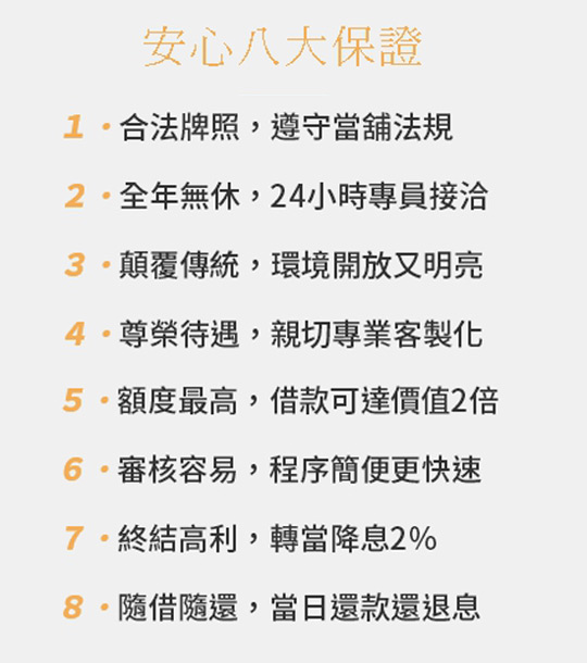 安心當舖經由政府合法立案當舖,在地服務多年,公司宗旨『微笑在臉、服務在心』,秉持著『專業在誠、以客為尊』的理念對待每一位客戶,將心比心、積極負責、專業且親切的態度,對於每一位來訪的客戶也絕對誠信保密,並提供專業最佳最低率借貸建議,保障每一位來訪客戶,我們要做到的是長久,並非一次性合作,希望讓客戶著實感受到安心借輕鬆還,也因如此累積很多回流顧客,得此因應而生『安心當舖』,我們絕對是您值得來電洽詢親臨。